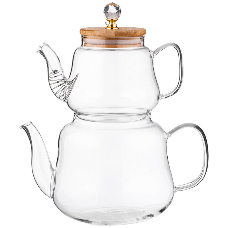 Набор для чаепития из 2-х оригинальных стильных чайников, который выдерживает высокую температуру кипящей воды.: нижний чайник объемом 1, 5 л используется для кипятка, верхний чайник объемом 630 мл используется как заварочный. В таком наборе заваривание чая или трав особенное, так как происходит процесс настаивания на паровой бане, что позволяет плавно раскрывать и сохранять всю ценность напитка. Изделия выполнены из экологически чистого жаропрочного стекла и подходят для использования на стеклокерамической, электрической варочной поверхности, на газовых плитах необходимо дополнительно использовать рассекатель. Крышка имеет уплотнительное силиконовое кольцо, благодаря которому она надежно фиксируется на чайнике. Фильтр из нержавеющей стали в заварочном чайнике препятствует попаданию трав из чайника в чашку. Ручка имеет очень удобною форму для надежного захвата. Кноб на крышке в форме кристалла из акрила, благодаря бликам и сиянию создает неповторимую уютную, радостную атмосферу во время чаепития. Набор служит украшением стола и будет прекрасным подарком родным и близким.