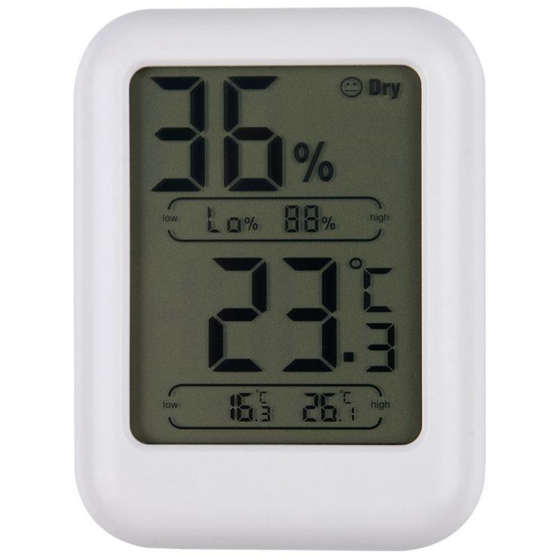 t в помещении (диапазон изм. от -50 до +70С), относительная влажность (диапазон изм. 10-99%), информация о самых высоких/низких значений температуры и влажности. Отображение уровня комфорта (шкала), размещение: настольное/настенное на металлическую поверхность (встроенные магниты), питание: 1.5В (AAA) x1