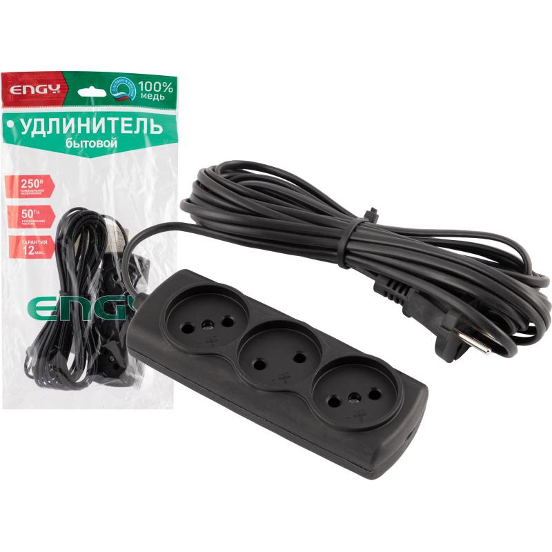 186750 Удлинитель Engy 'Эконом' 10м/3роз (ШВВП 2х0.75) черный