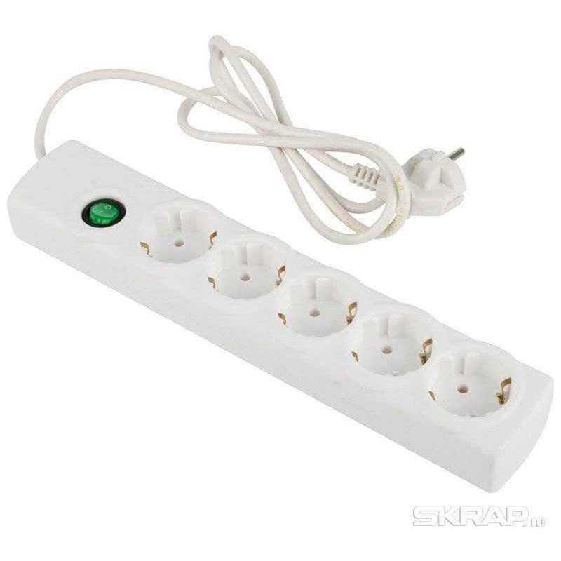5 розеток, с заземлением, 220В, 6А, суммарная мощность нагрузки 2.2кВт, длина шнура 3м, выключатель