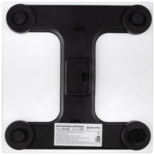 Максимальная нагрузка 150кг, Цена деления 100грамм, Стеклянная поверхность, Размер платформы 26*26см, LСD дисплей, Указатель температуры воздуха на дисплее, Прорезиненные ножки против скольжения, Выбор единиц измерения (кг, фунты), Автоотключение, Индикатор перегрузки и заряда батарейки, Питание от батареек 2*ААА (1,5В), Напряжение 3В