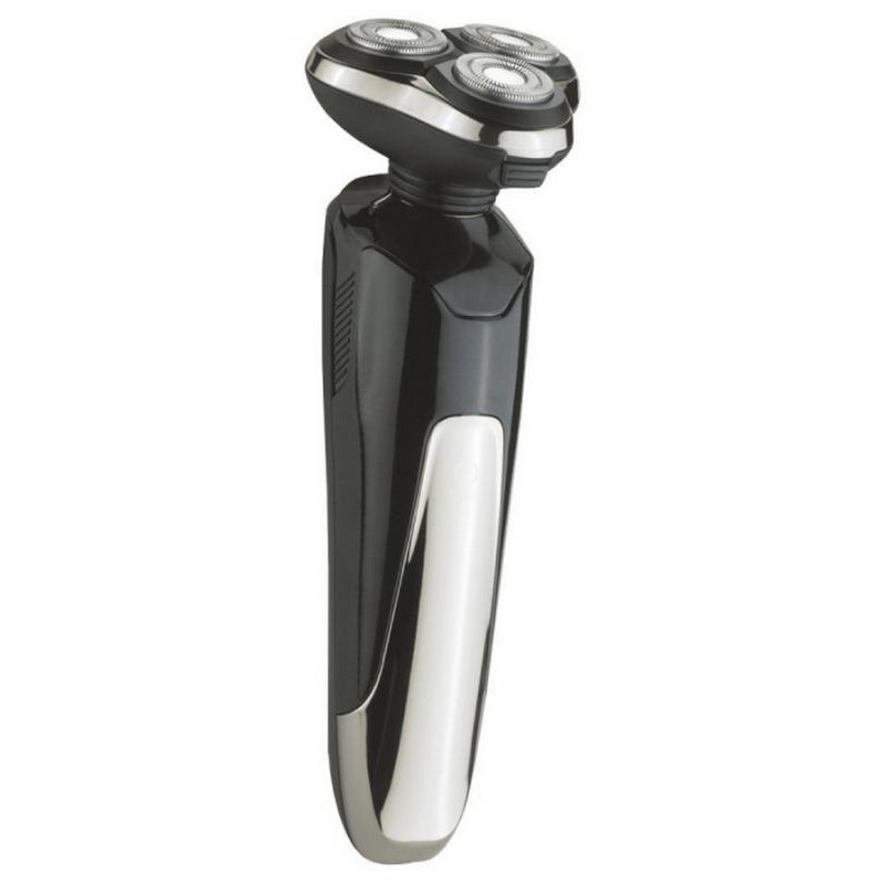 акк/сеть, номинальная потребляемая мощность 5W, роторная, 3 бреющих головки, сухое бритье, время зарядки 2ч, время работы 2ч, влагозащитный корпус, двухдорожечные ножи, плавающие бреющие головки
