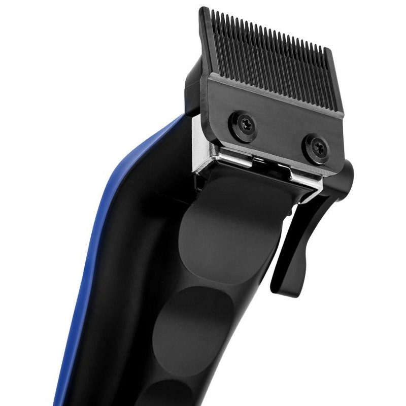 5Вт, фиксированные лезвия из стали, керамические подвижные лезвия с титановым покрытием, работа от сети и аккумулятора 3ч, 4 установки длины: на корпусе 0.8/1.2/1.6/2мм+8 насадок (1.5/3/4.5/6/9/12/16/19мм), смазочное масло, щеточка