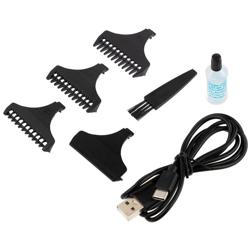 3Вт, лезвия из нерж.стали, LED дисплей, 3 насадки-гребня 0.5-1-1.5мм, работа от аккумулятора (600mAh), USB шнур, щеточка, масло для смазки