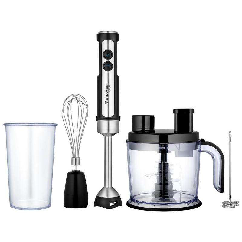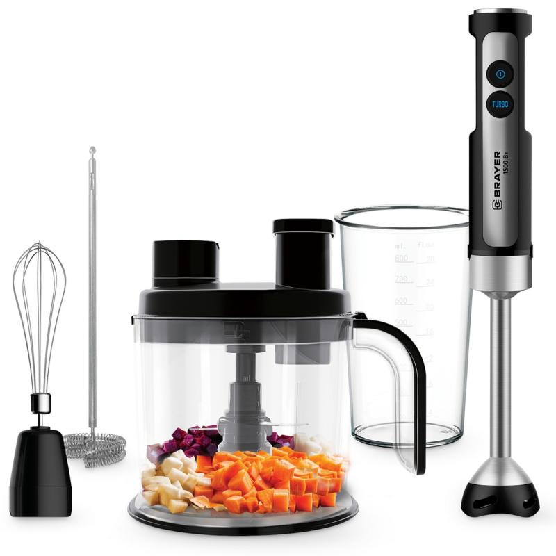 1500Вт, лезвия титан, погружная часть нерж.сталь, турборежим, плавная регулир. скорости, венчик, стакан 800мл, измельчитель 1500мл, насадка д/нарезки кубиками, капучинатор,