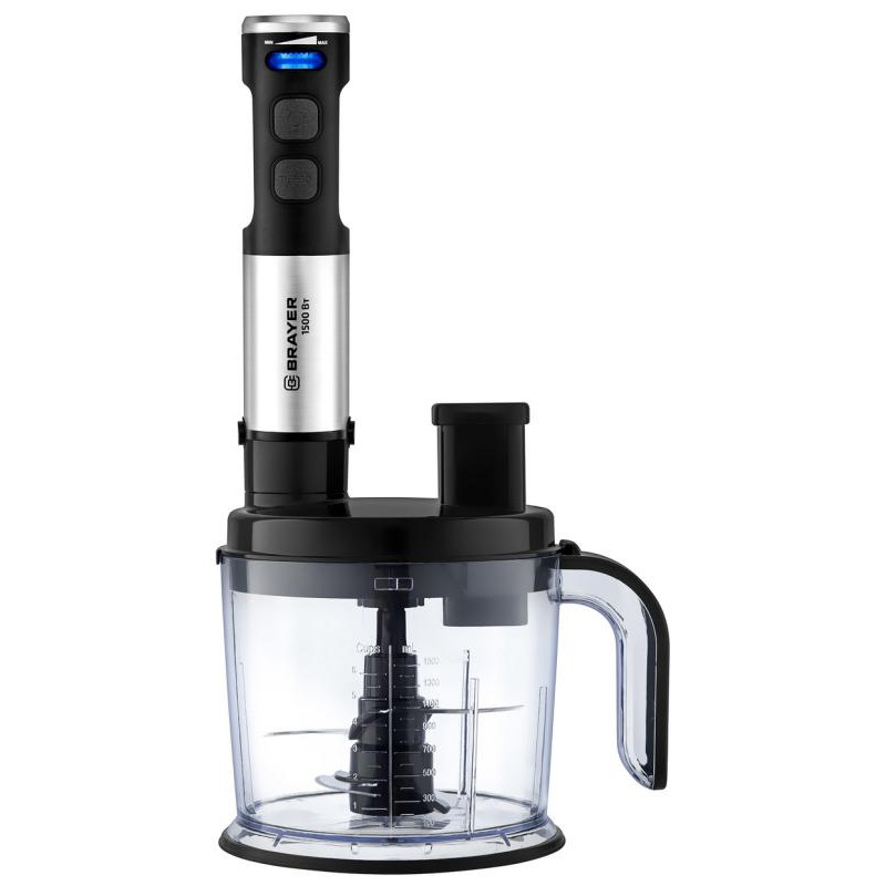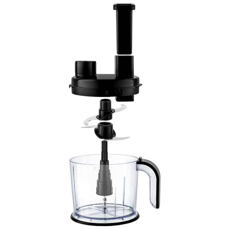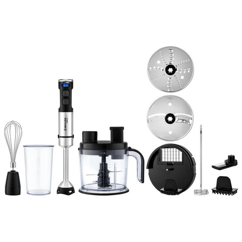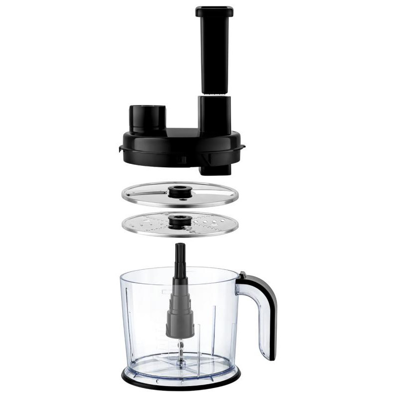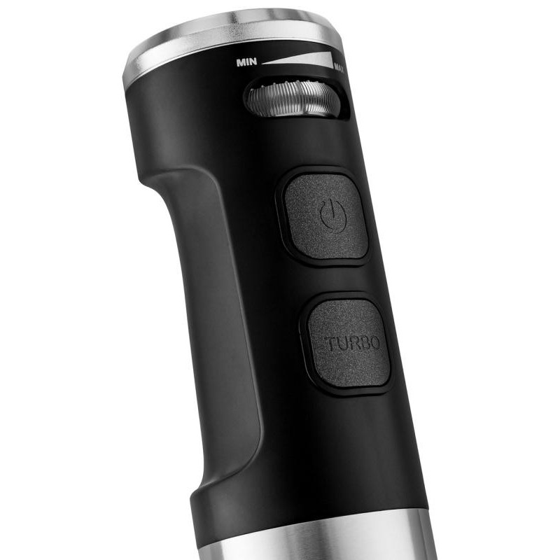 1500Вт, лезвия из титана, погружная часть - нерж.сталь, стакан 800мл, измельчитель 1500мл, диск для терки, диск для шинковки, насадка для нарезки продуктов кубиками, S-образный нож из нерж.стали, толкатель для чистки диска, венчик, плавная регулировка скорости, турборежим
