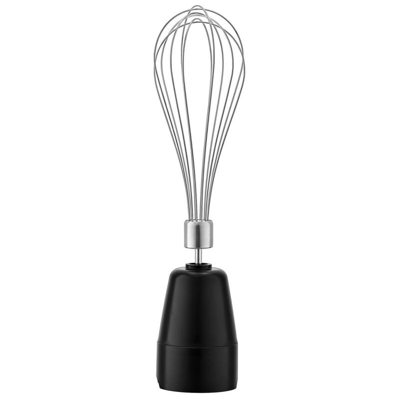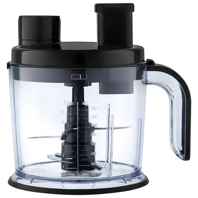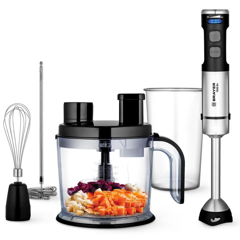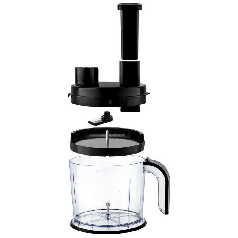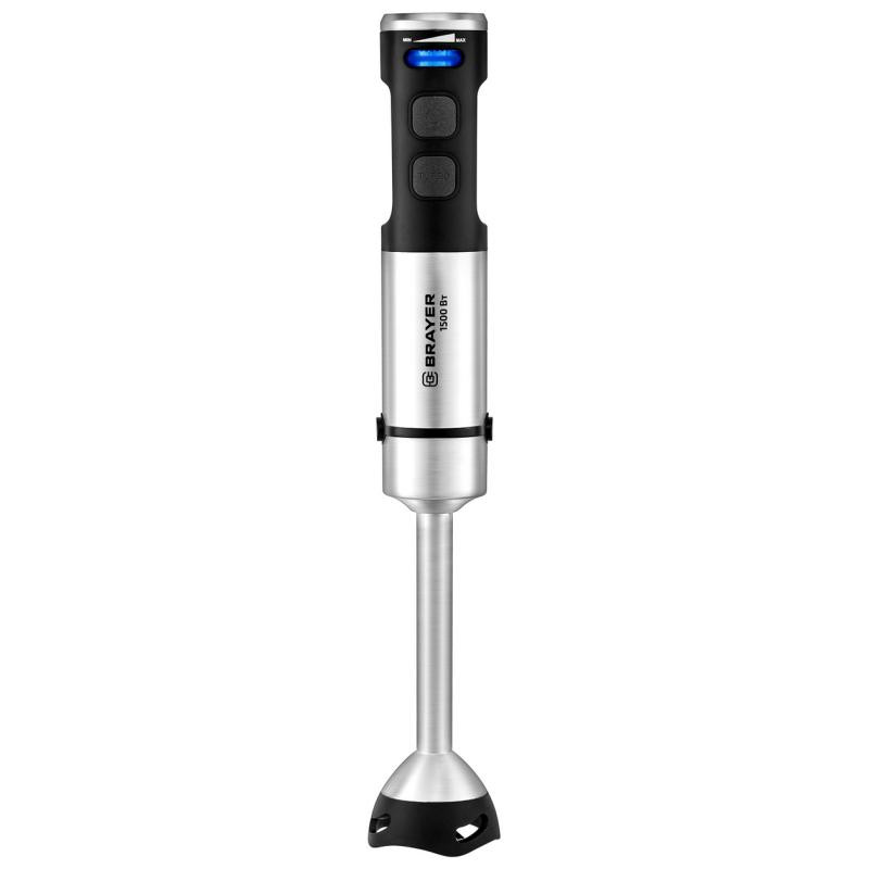 1500Вт, лезвия из титана, погружная часть - нерж.сталь, стакан 800мл, измельчитель 1500мл, диск для терки, диск для шинковки, насадка для нарезки продуктов кубиками, S-образный нож из нерж.стали, толкатель для чистки диска, венчик, плавная регулировка скорости, турборежим