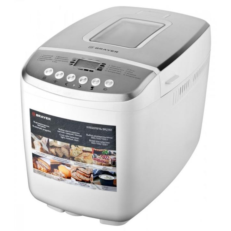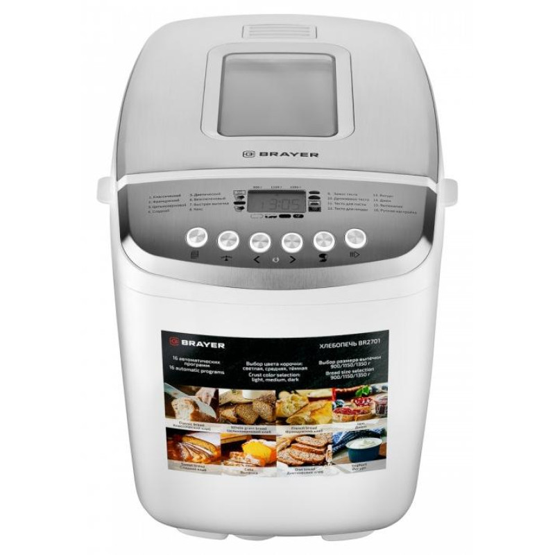 850Вт, 16 программ, выбор размера выпечки 900/1150/1350гр, LCD-дисплей с подсветкой, антиприг.покрытие, 2 месильных лезвия с керамич.покрытием, ложка, стакан, таймер отсрочка 13ч, книга рецептов