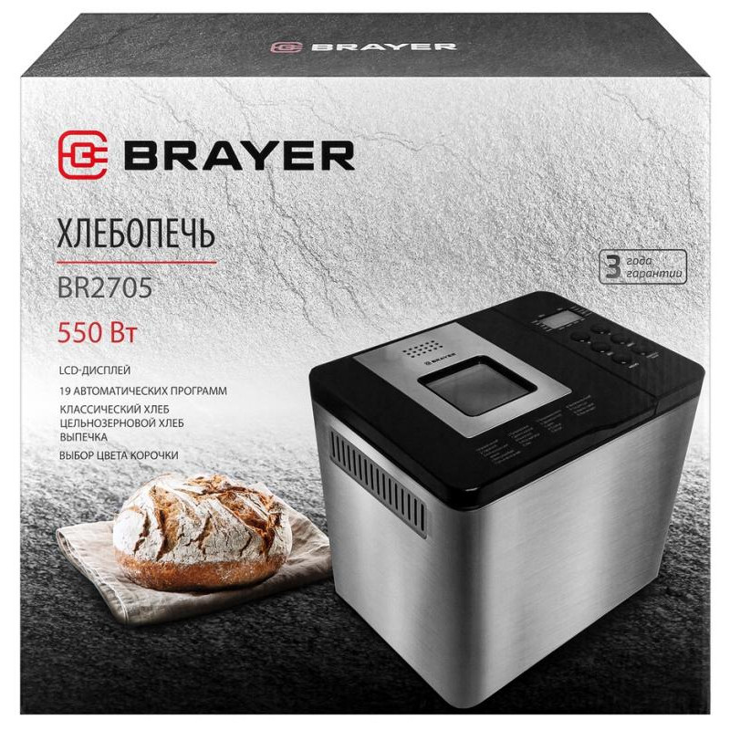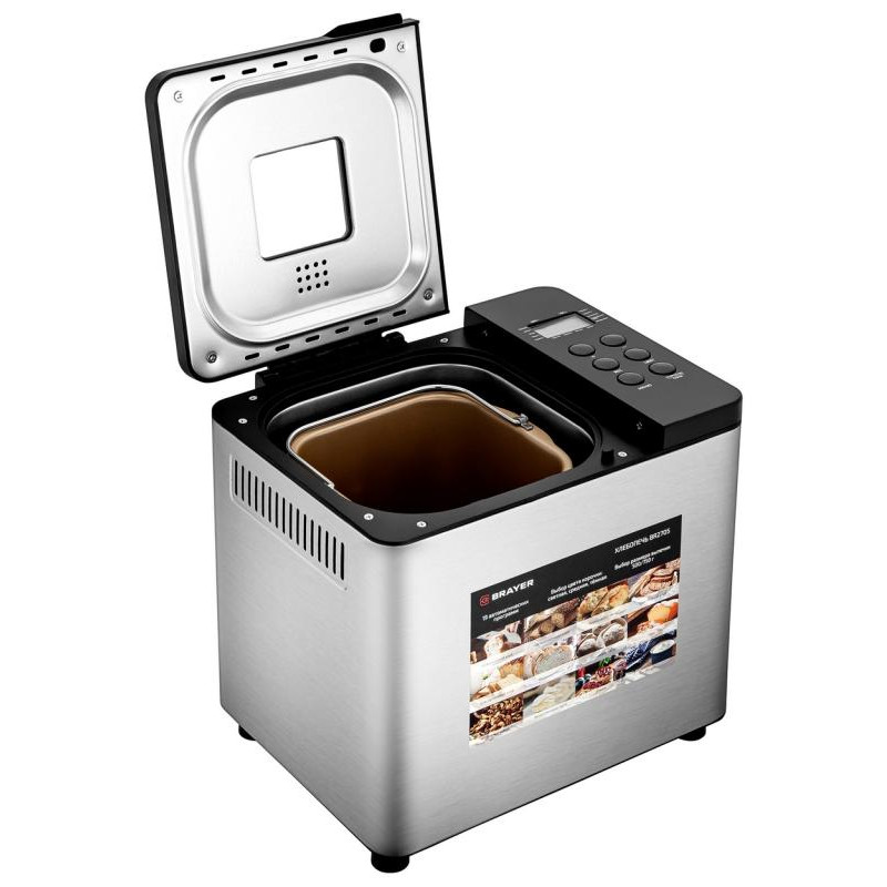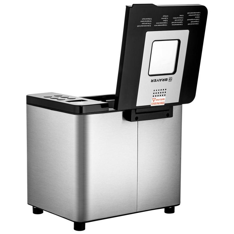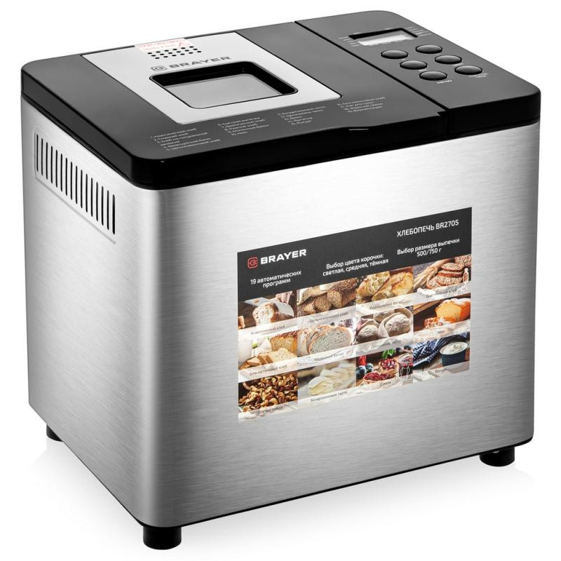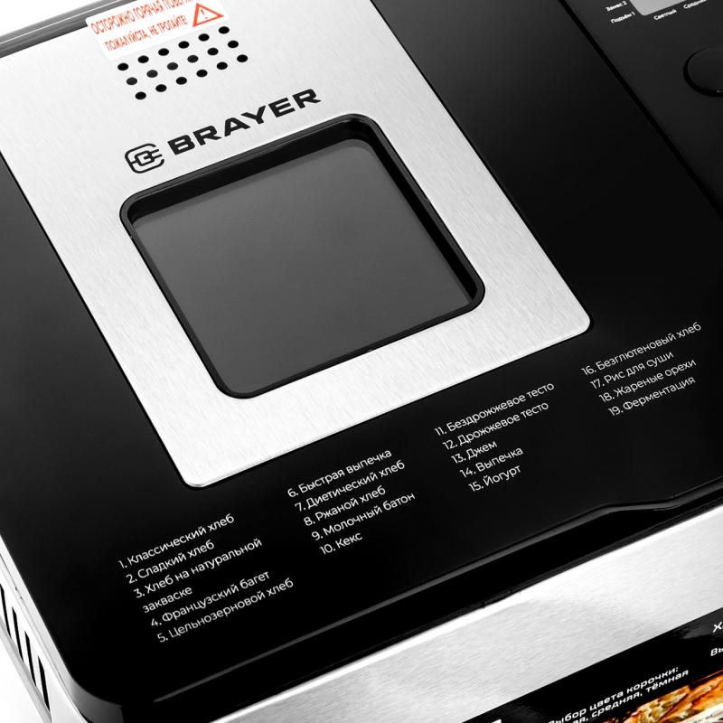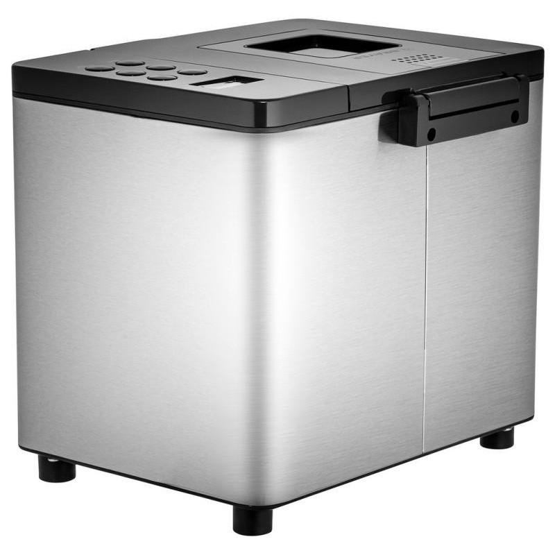 550Вт, 19 программ, выбор размера выпечки 500/750гр, LCD-дисплей, корпус из нержавеющей стали, антиприг.покрытие, функция выбора цвета корочки: светлая/средняя/тёмная, добавление дополнительных ингредиентов, лопасть д/замеса теста, ложка, стакан, таймер отсрочка 15ч, книга рецептов, поддержание температуры после выпекания 60мин