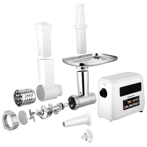 2000 Вт, реверс, насадки кеббе, колбасы, д/овощей (терка, шинковка), драники, 3 диска, LED-дисплей, сенсорное управление, толкатель, съемный лоток из стали, прорезиненные ножки