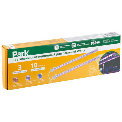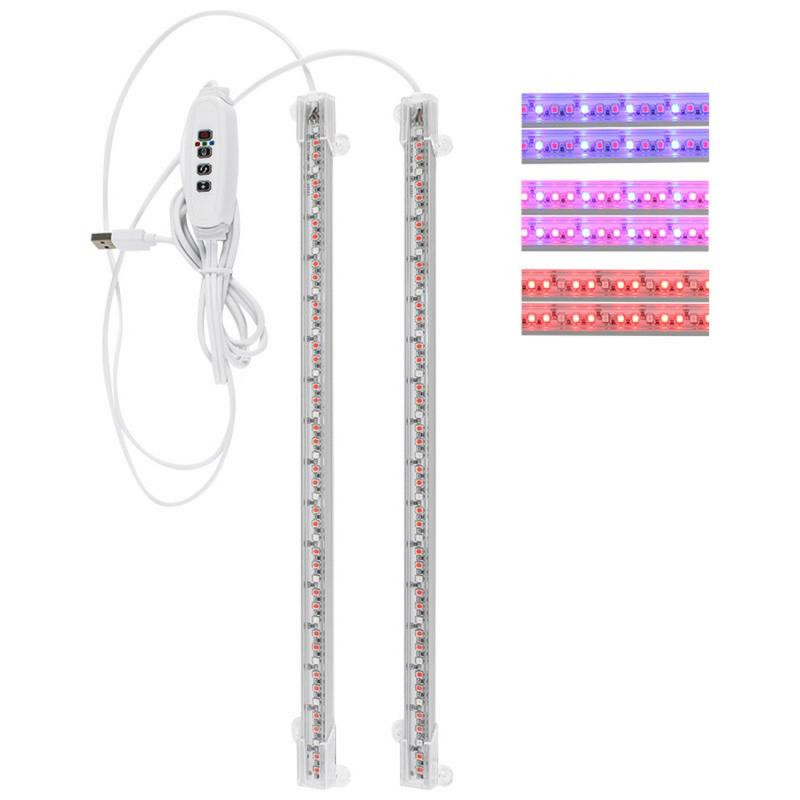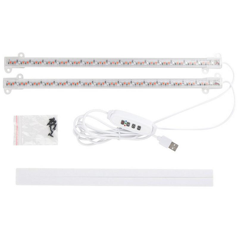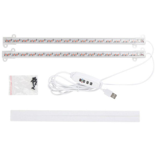10Вт, 5В, 2А, 33см, провод 1м, 96 LED лампочек (2:1 красный и синий свет), пластмасса/металл, яркость 10 уровней, световой поток 720 лм, фитоспектр красный свет 625-630нм, синий свет 455-460нм, режимы света красный/синий/смешанный, крепеж в комплекте, зарядка от USB, адаптер в комплект не входит