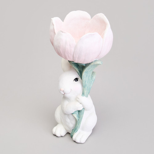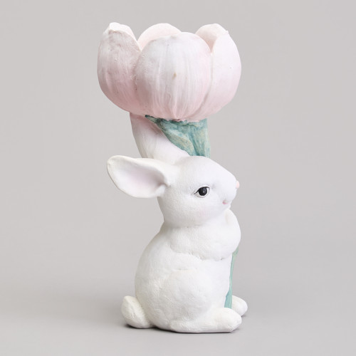 Кролик с выразительными глазками и милой улыбкой, словно символизируя весну и радость, гордо держит великолепный тюльпан с мягкими розовыми лепестками. Цветок, словно раскрывшийся навстречу солнцу, добавляет яркой свежести и живости, делая фигурку настоящим произведением искусства.