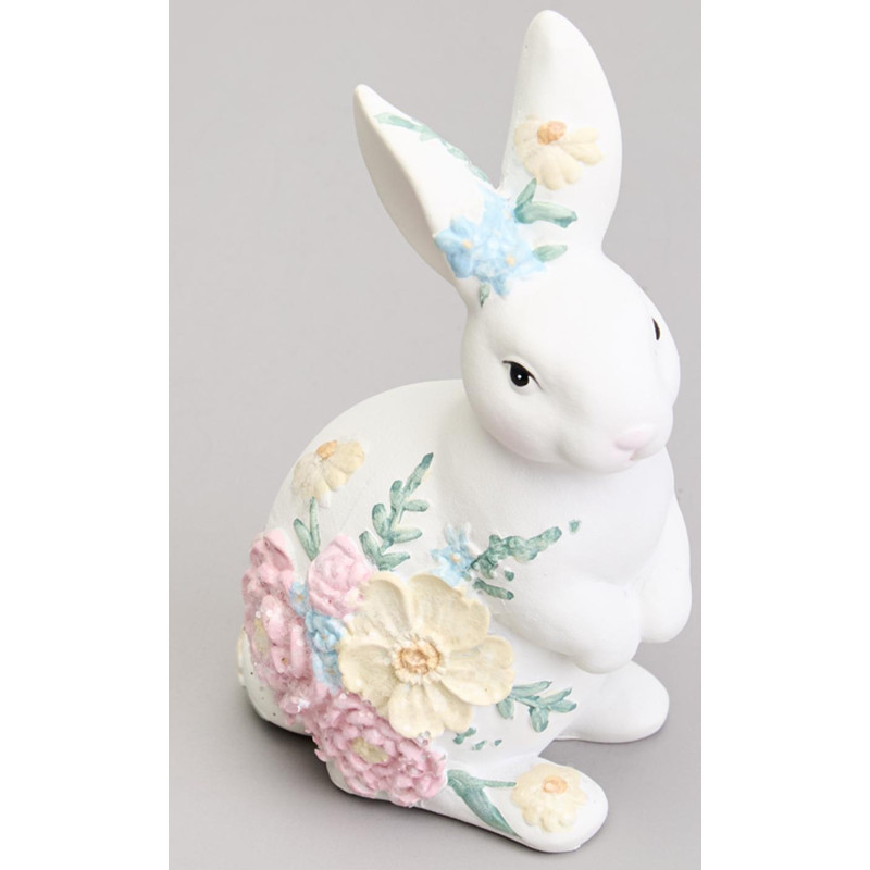 Кролик с милыми большими глазами и мягкой улыбкой выглядит так, будто улыбается целому миру. Его изысканный силуэт украшен красивыми цветами — яркими розами и нежными цветками, расположенными на боках, которые добавляют фигурке жизни и весеннего обаяния. Ушки, аккуратные и изящные, словно танцуют на ветру, подчеркивая легкость и свежесть образа.