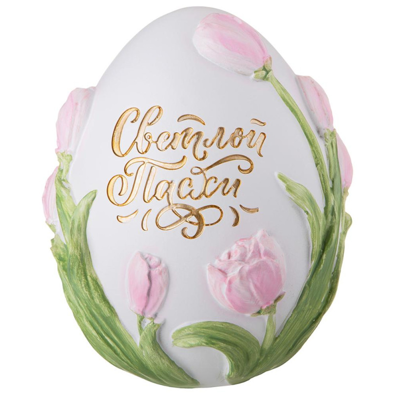 Декоративная фигурка "Яйцо" покрыта нежными весенними цветами и украшена изысканным золотым текстом с поздравлением. Такую фигурку можно поместить на праздничном на столе, приподнести в подарок или украсить традиционную пасхальную корзинку с куличами.