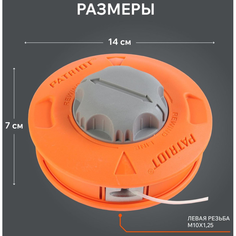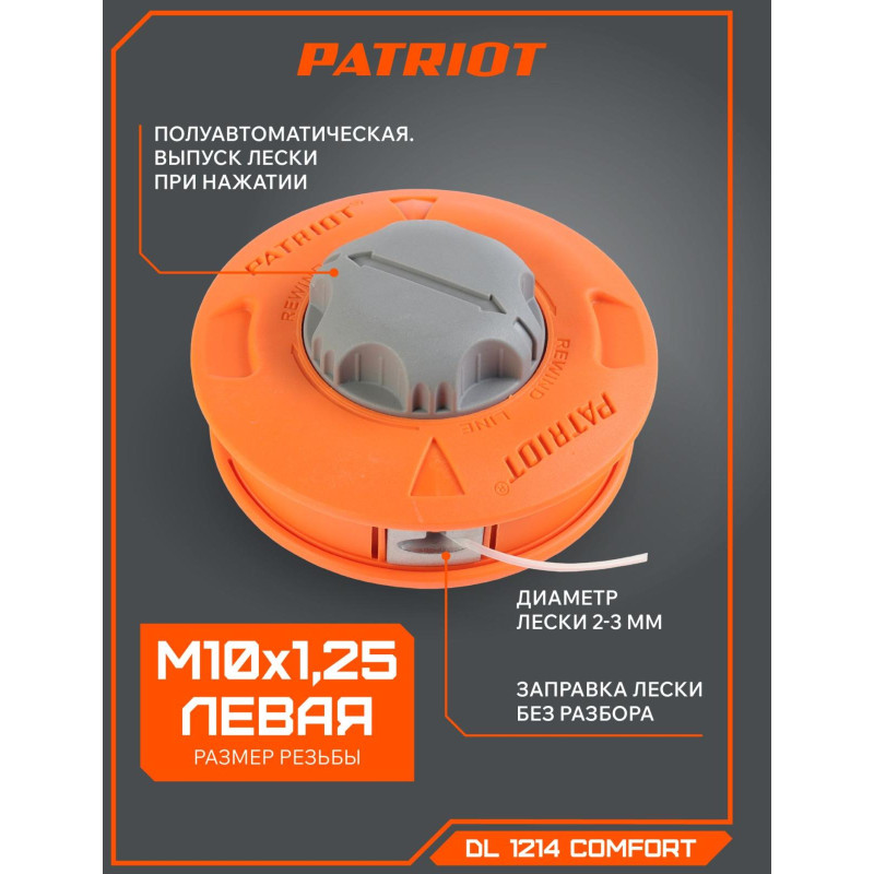 Катушка Patriot DL-1214 Comfort подходит ко всем бензотриммерам с прямой штангой. Применяется для скашивания травы любых видов. Крепление на оси М10х1, 25 LH. Диаметр лески 2, 0-3, 0 мм. Леска подается автоматически - для этого достаточно слегка ударить катушку о землю. Заправка лески осуществляется без снятия крышки с катушки, достаточно вставить в отверстия катушки леску и намотать ее с помощью кнопки-фиксатора.