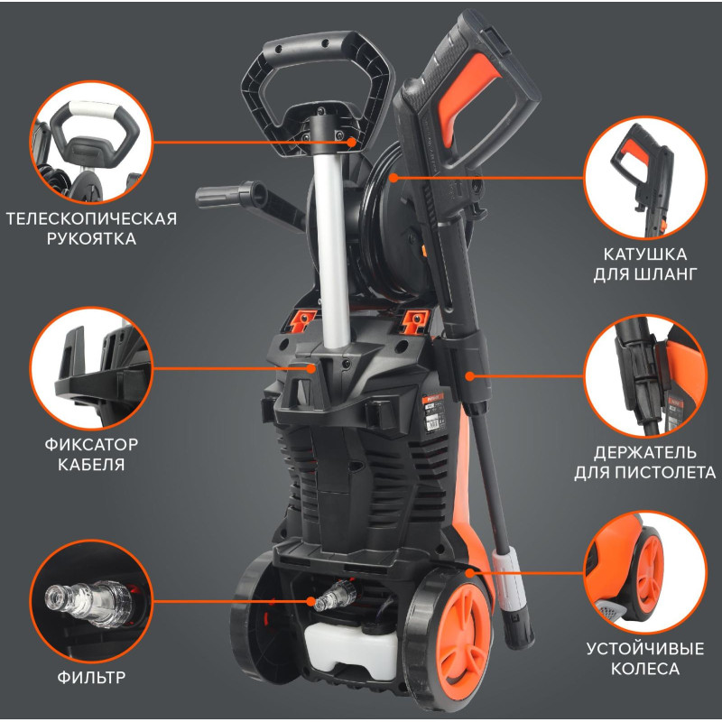 Средняя самовсасывающая мойка высокого давления для бытового использования. В стандартную комплектацию входят все необходимые насадки, фильтры и аксессуары, самовсасывающий насос выполнен из алюминиевого сплава.