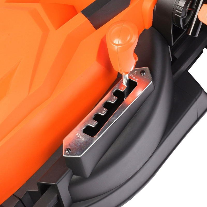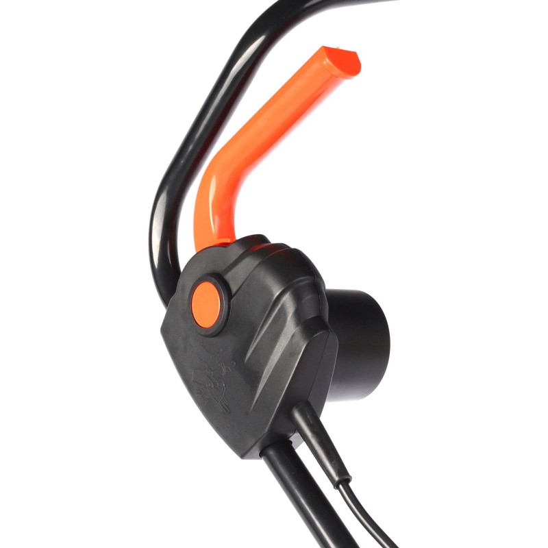 Складная рукоятка, съёмный травосборник с индикатором наполнения и компактный размер позволяют легко транспортировать и хранить газонокосилку.