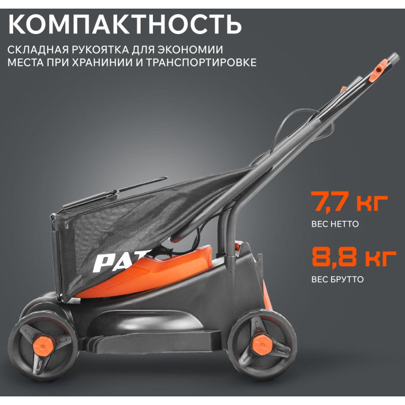Компактная и сверхлегкая газонокосилка Patriot PT 1130E идеально подходит для ухода за небольшим участком. Легкость управления достигается благодаря малому весу пластикового корпуса. Двигатель устойчив к кратковременным перегрузкам. Стартовый курок снабжен кнопкой-предохранителем для защиты от случайного запуска. Травосборник объёмом 30 литров со встроенным индикатором заполнения опустошается особенно легко. Ручка быстро складывается, обеспечивая удобство транспортировки и хранения.