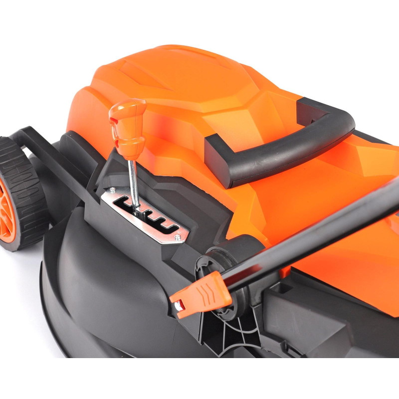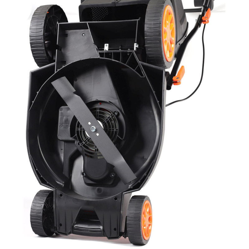 Складная рукоятка, съёмный травосборник и компактный размер позволяют легко транспортировать и хранить газонокосилку.