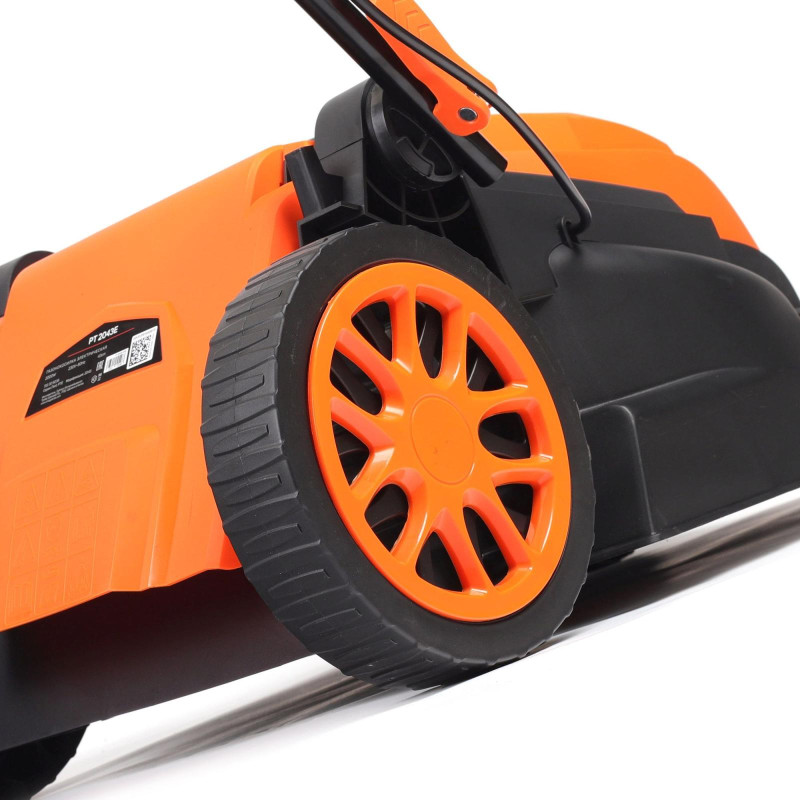 Мощная электрическая газонокосилка РТ 2043 Е в обновленном дизайне с изменяемой высотой скашивания предназначена для срезания и сбора травы на ровной площади малых и средних приусадебных участках.