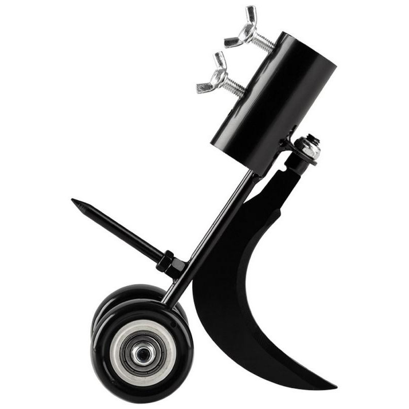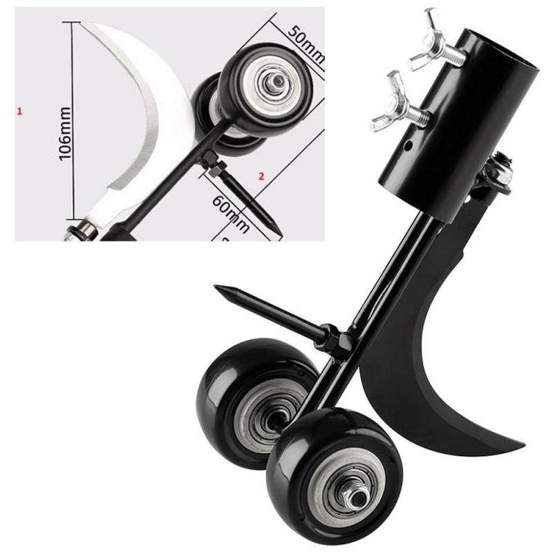 размер изделия: длина 190мм, d под черенок 29мм, d колеса 50мм (2шт), размер серпа 106 мм, сталь/резина, применяется в узких пространствах и труднодоступных местах