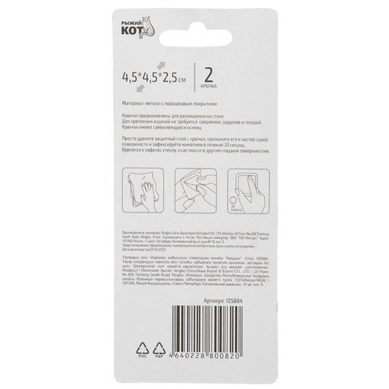 105884 Набор крючков на самоклеящейся основе 'Квадрат' (2 шт) металл Рыжий кот