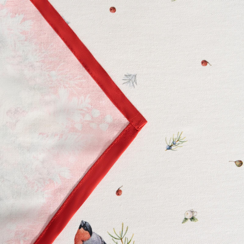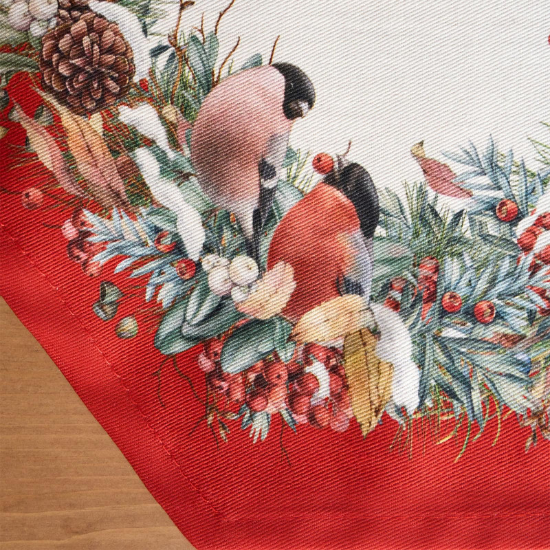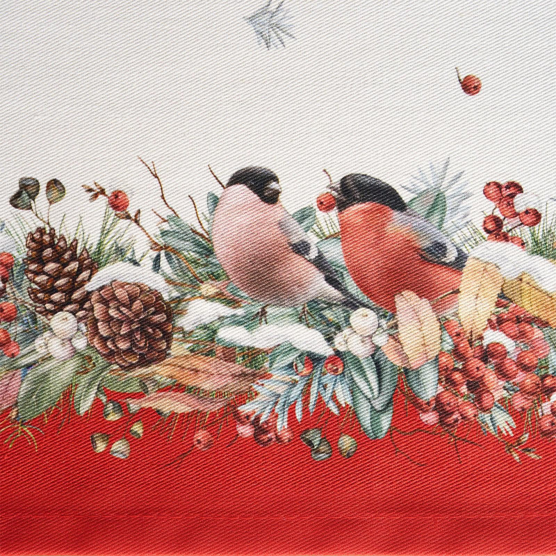 Принт выполнен в технике цифровой печати: по краям композиция из снегирей, еловых ветвей, шишек, заснеженных листьев и красных ягод на светлом фоне с насыщенной красной каймой. Цвета остаются яркими даже после многократных стирок. Оформление симметрично по краям, благодаря чему дорожка эффектно смотрится на столе.