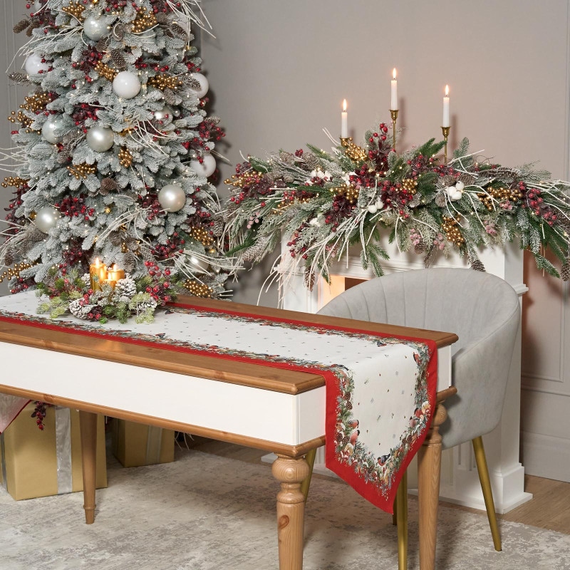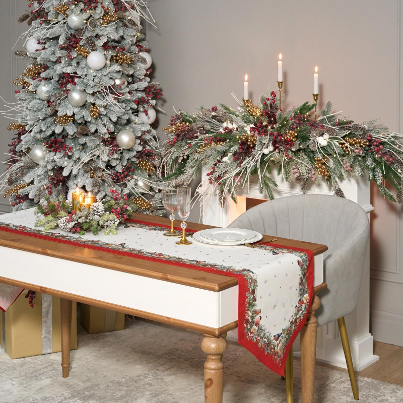 Хорошо комбинируется с однотонными скатертями, посудой в классическом или прованском стиле, текстилем в зимней палитре. Подходит для дома, дачи, загородного коттеджа. Размер 45×215 см идеально подойдёт для прямоугольных и овальных столов, позволяя создать аккуратный и завершённый образ сервировки.