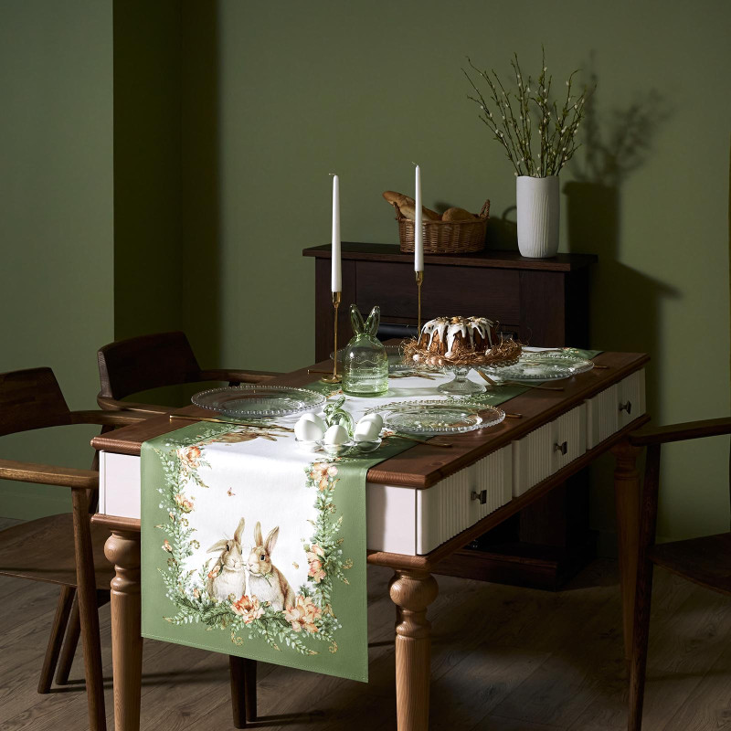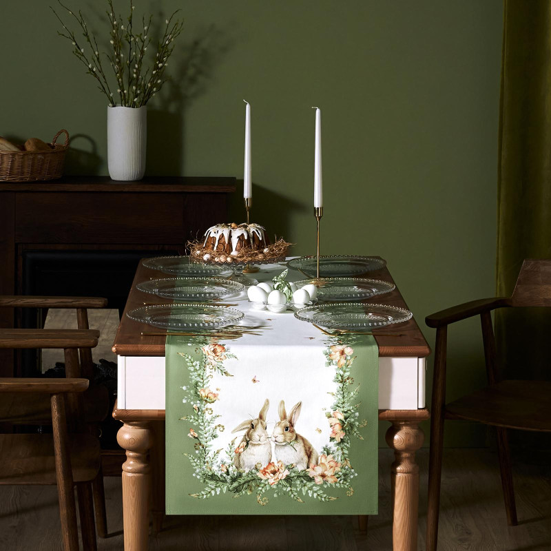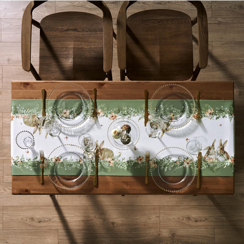 Принт с милыми кроликами, нежными зелёными оттенками и природными мотивами делает изделие выразительным элементом декора, благодаря которому стол становится центром внимания. Дорожка создаёт атмосферу уюта и гармонии на кухне, в столовой, гостиной или на даче.