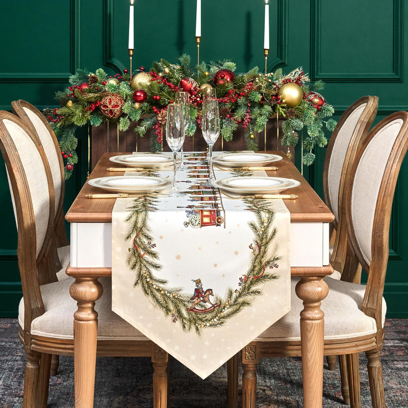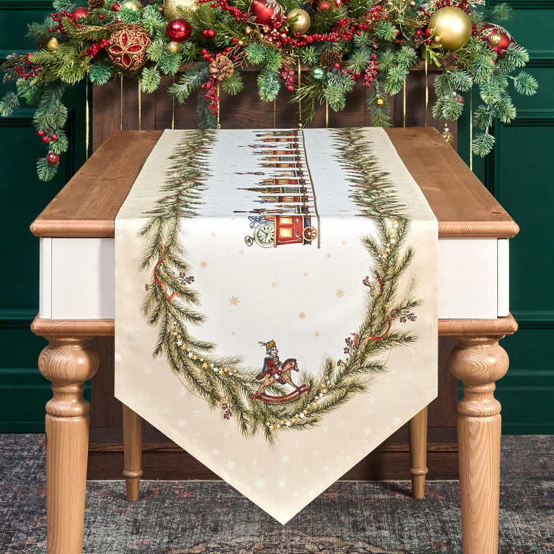 Хорошо комбинируется с однотонными скатертями, посудой в классическом или прованском стиле, текстилем в зимней палитре. Подходит для дома, дачи, загородного коттеджа. Размер 45×300 см идеально подойдёт для прямоугольных и овальных столов, позволяя создать аккуратный и завершённый образ сервировки.