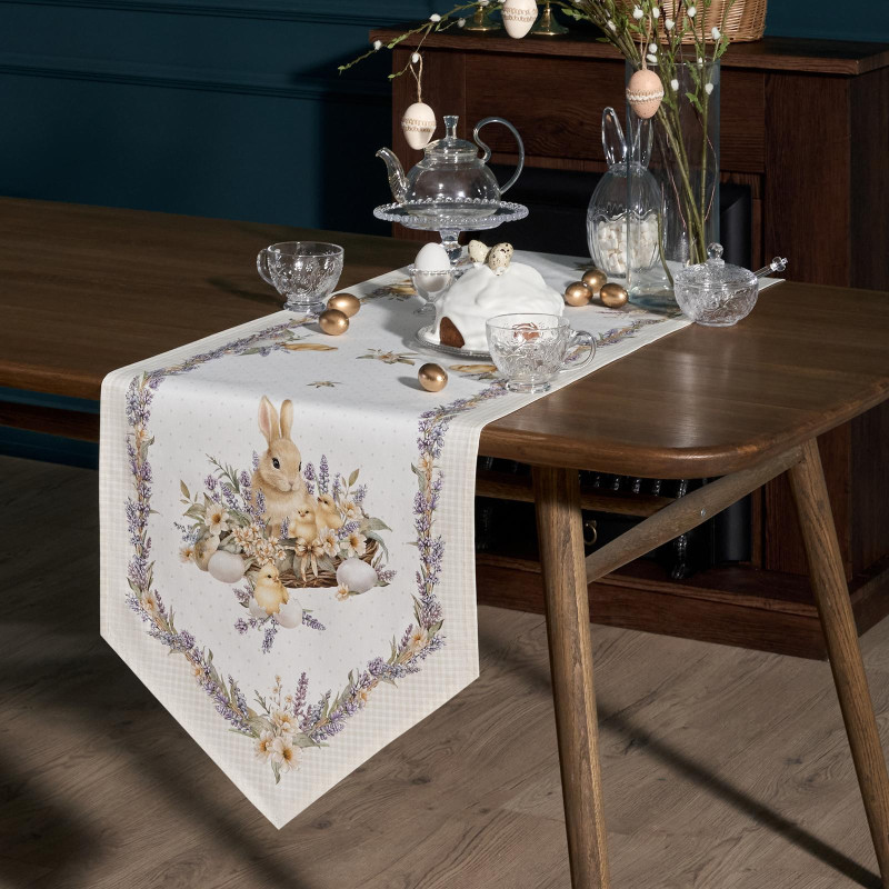 Принт с милыми кроликами, нежными оттенками и природными мотивами делает изделие выразительным элементом декора, благодаря которому стол становится центром внимания. Дорожка создаёт атмосферу уюта и гармонии на кухне, в столовой, гостиной или на даче.