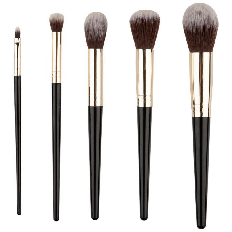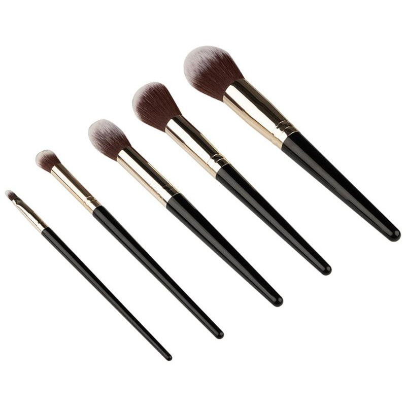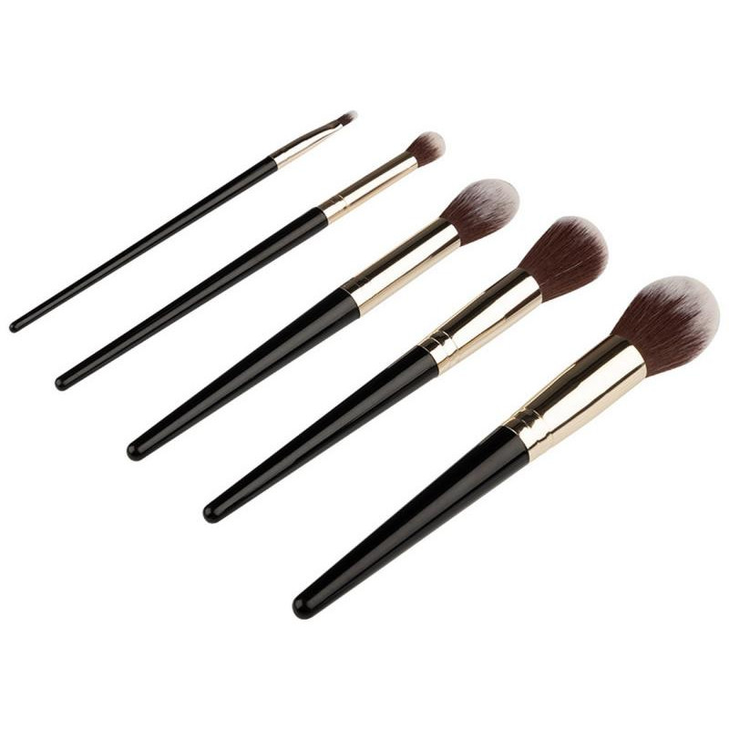 пластмасса/алюминий/нейлон, цвет ручек черный, в состав входит кисть для пудры, кисть для пудровых румян, кисть для кремовых румян, кисть для макияжа губ, кисть для растушевки, размер 15-18 см