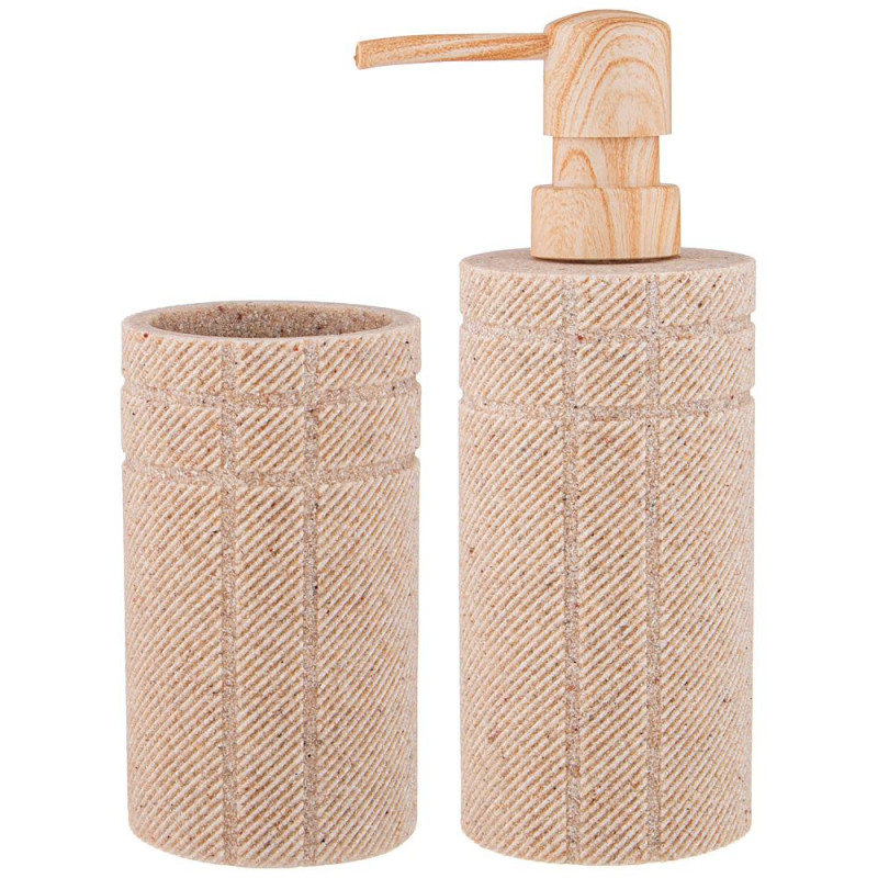 Набор аксессуаров для ванной комнаты состоит из дозатора для жидкого мыла и подставки-стакана.