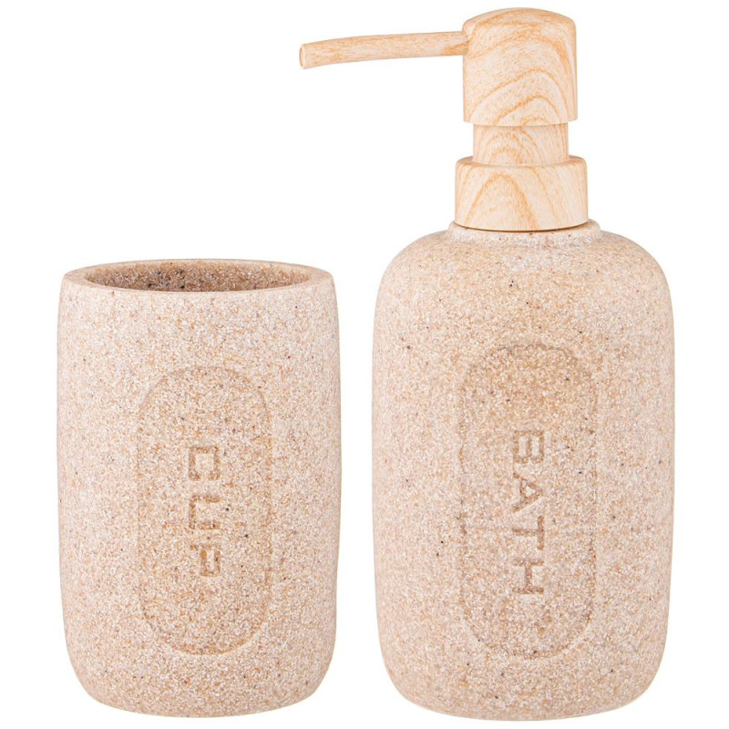 Набор аксессуаров для ванной комнаты состоит из дозатора для жидкого мыла и подставки-стакана.