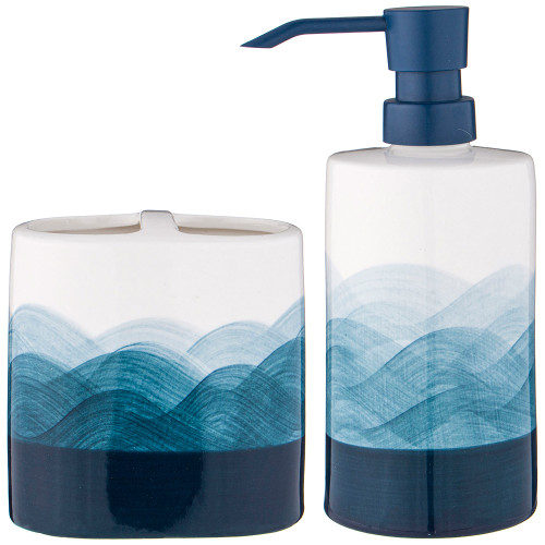 Набор аксессуаров для ванной комнаты состоит из дозатора для жидкого мыла и подставки-стакана.