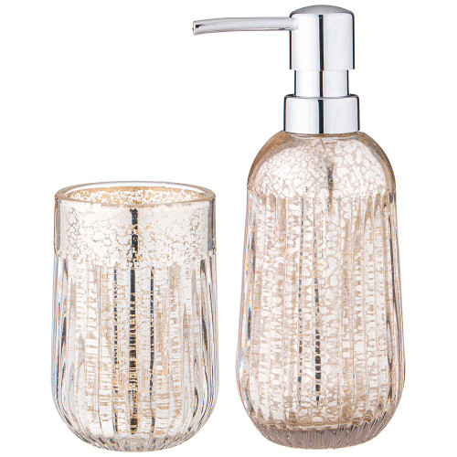 Набор аксессуаров для ванной комнаты состоит из дозатора для жидкого мыла и подставки-стакана.