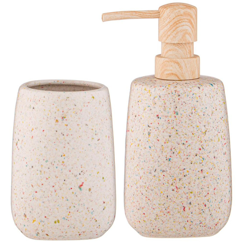 Набор аксессуаров для ванной комнаты состоит из дозатора для жидкого мыла и подставки-стакана.