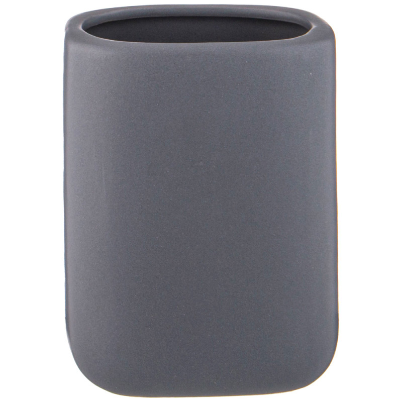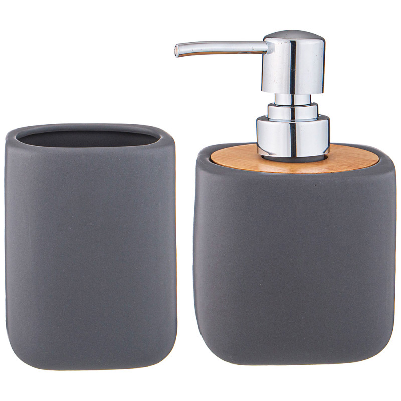 Набор аксессуаров для ванной комнаты состоит из дозатора для жидкого мыла и подставки-стакана.