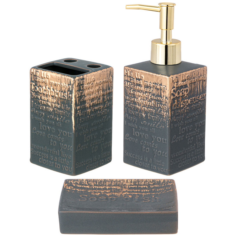 Секрет удачного оформления любого интерьера — яркие аксессуары! Дозатор для ванной не только внесёт изюминку в интерьер, но и придаст ему стильность, уют и ощущение завершенности. В комплект входит дозатор для жидкого моющего средства, мыльница и стакан для зубных щеток.