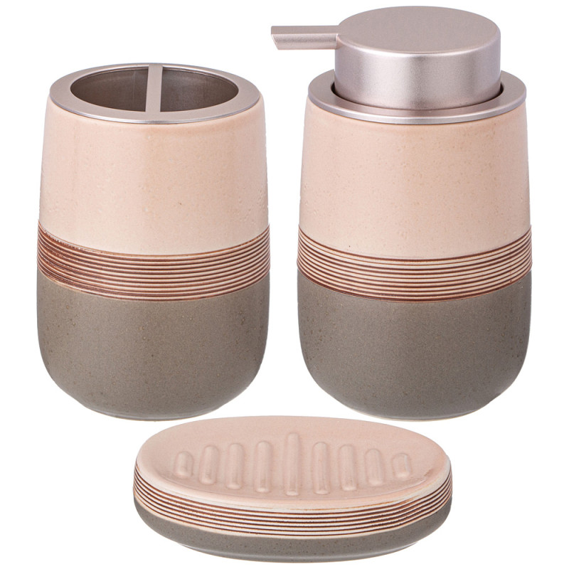 Секрет удачного оформления любого интерьера — яркие аксессуары! Дозатор для ванной не только внесёт изюминку в интерьер, но и придаст ему стильность, уют и ощущение завершенности. В комплект входит дозатор для жидкого моющего средства, мыльница и стакан для зубных щеток.