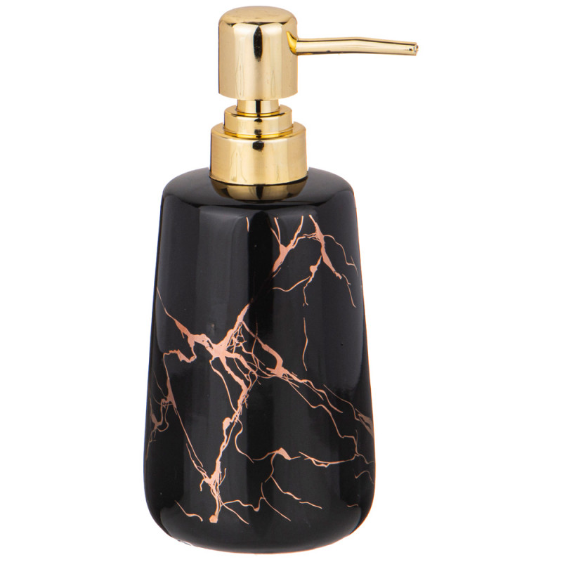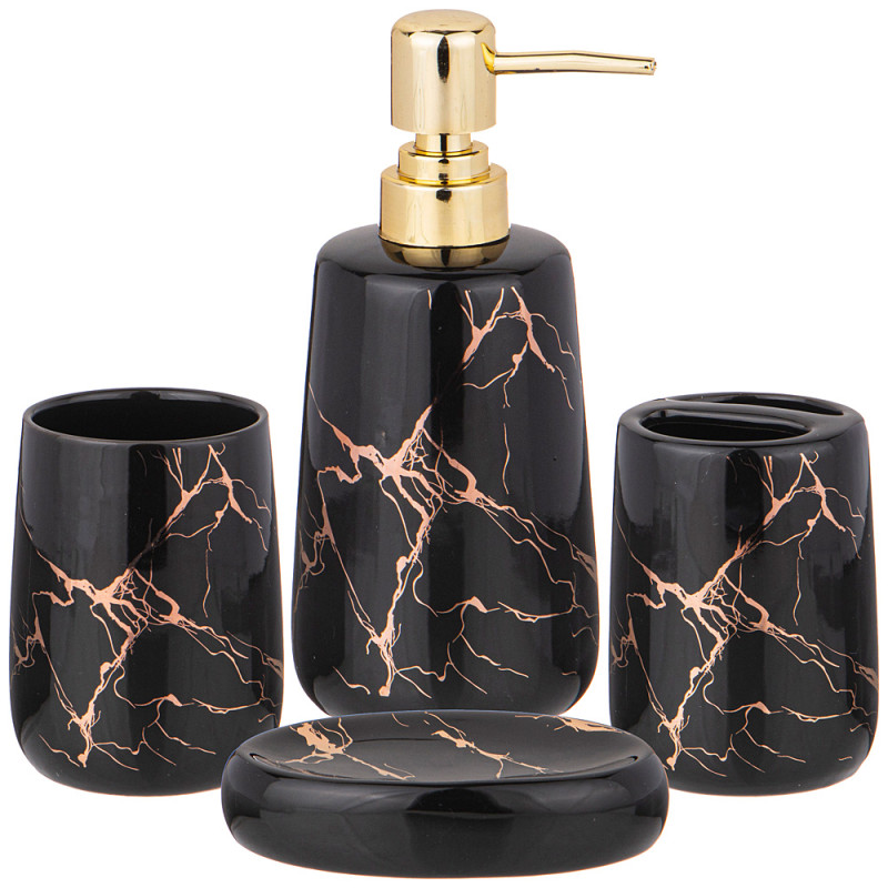 Набор аксессуаров для ванной комнаты состоит из дозатора для жидкого мыла, подставки-стакана, подставки для зубных щёток и мыльницы для кускового мыла.