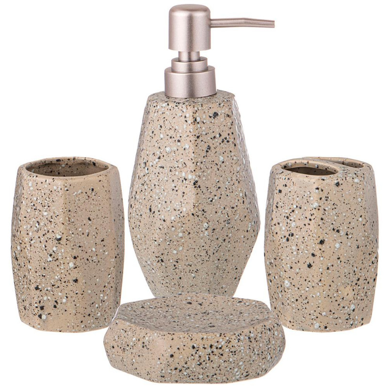 Набор аксессуаров для ванной комнаты состоит из дозатора для жидкого мыла, подставки-стакана, подставки для зубных щёток и мыльницы для кускового мыла.