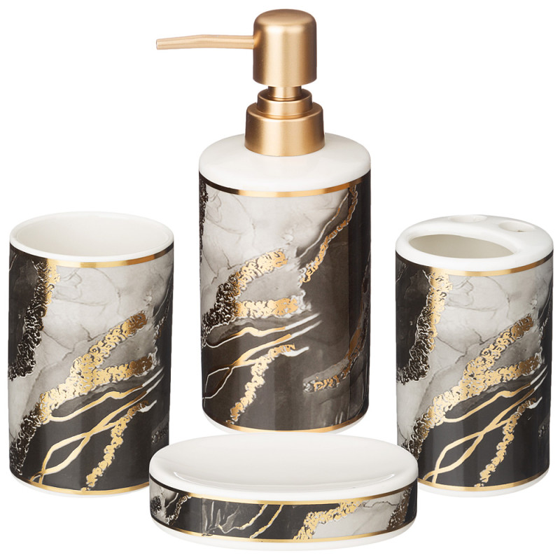 Набор аксессуаров для ванной комнаты состоит из дозатора для жидкого мыла, подставки-стакана, подставки для зубных щёток и мыльницы для кускового мыла.