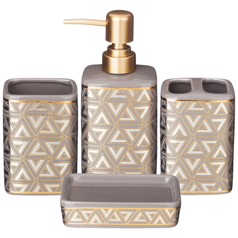Набор аксессуаров для ванной комнаты состоит из дозатора для жидкого мыла, подставки-стакана, подставки для зубных щёток и мыльницы для кускового мыла.