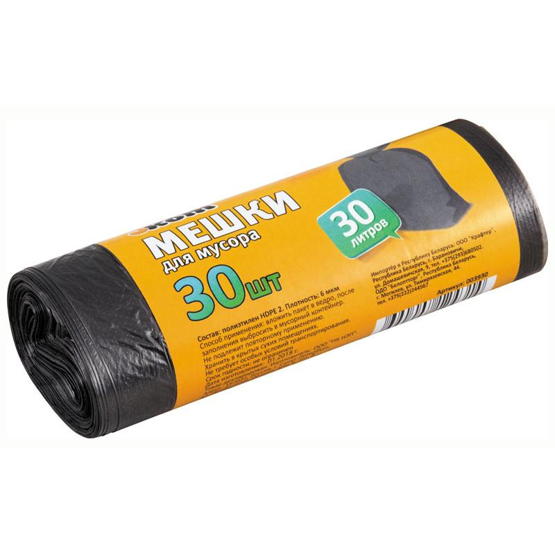 30л, 30шт, материал-полиэтилен низкого давления, плотность 6мкм, цвет-черный