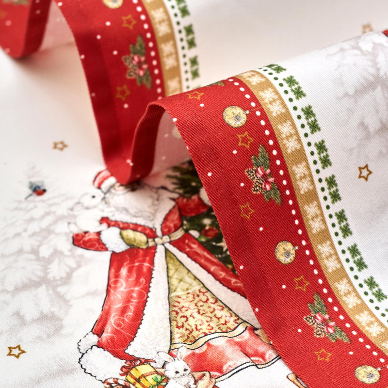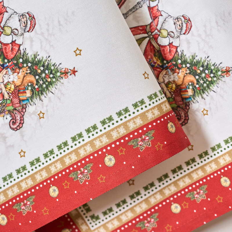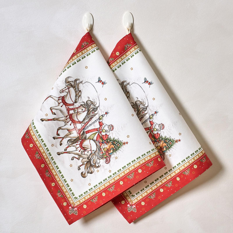 Рисунок нанесён методом современной цифровой печати, что обеспечивает чёткость линий и стойкость цвета даже после многократных стирок. Белый фон и насыщенные оттенки делают полотенца выразительным элементом новогоднего декора.