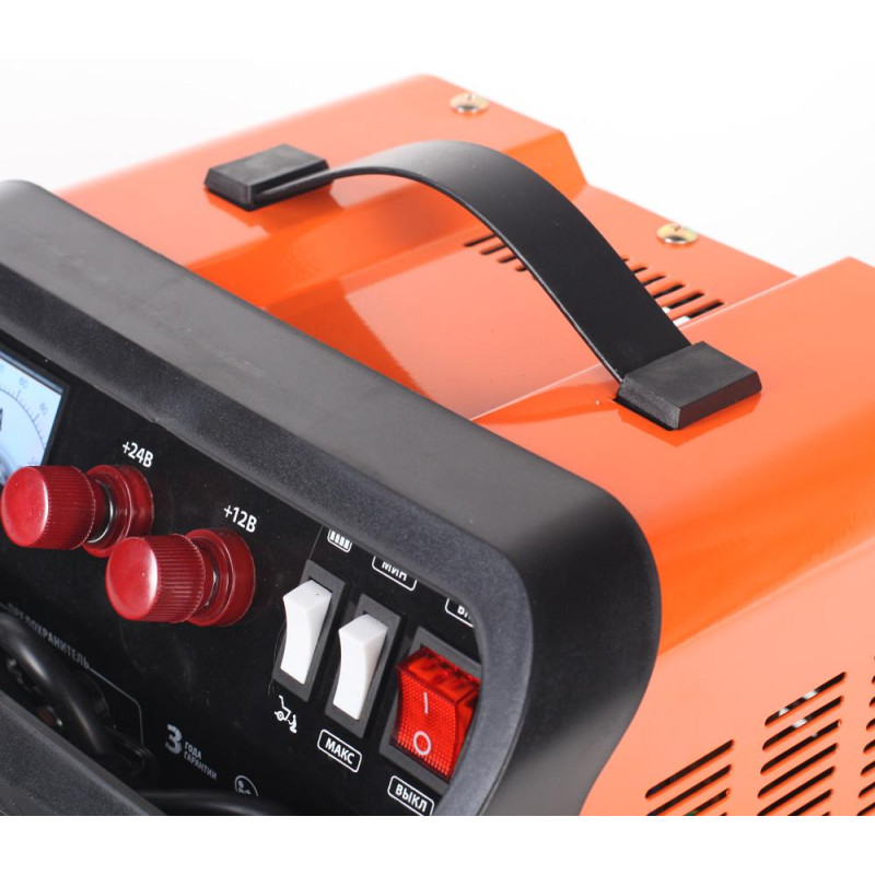 Устройство для бытового, полупрофессионального или профессионального использования. Предназначено для зарядки свинцовых, кислотных аккумуляторов напряжением 12В и 24В, облегчения запуска автомобиля в холодную погоду. 2 ступени зарядки тока. Ускоренный режим зарядки с повышенным током. Амперметр, защита от перегрузки, неправильной полярности, короткого замыкания.