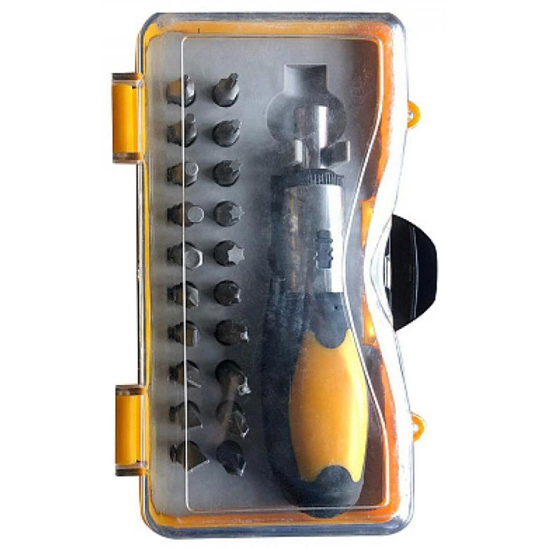 хром-ванадиевая сталь, полипропилен, термопластичная резина, отвертка-трещотка, биты 25мм-20шт (PH1, PH2, PH3, PZ1, PZ2, SL3, SL4, SL5, SL6, SL7, H2, H3, H4, H5, H6, T10, T15, T20, T25, T30), пластиковый кейс