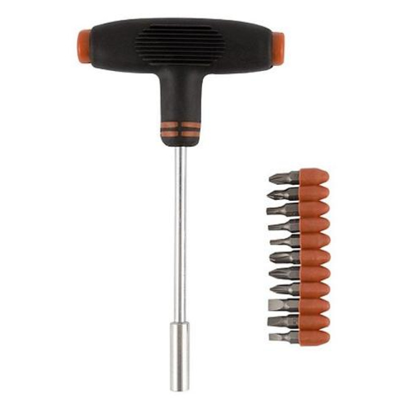 хром-ванадиевая сталь, полипропилен, термопластичная резина, ПВХ, T-образная ручка, биты 25мм-11шт(SL4, SL5, SL6, PH1, PH2, PH3, T10, T15, T20, PZ1, PZ2)