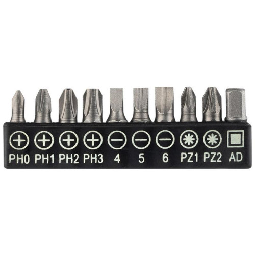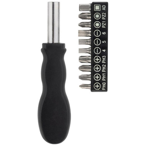 углеродистая сталь/хром-ванадиевая сталь/полипропилен/ПВХ, в наборе:отвертка, биты 25 мм- 9 шт (PH0, PH1, PH2, PH3, SL4, SL5, SL6, PZ1, PZ2), адаптер 1/4